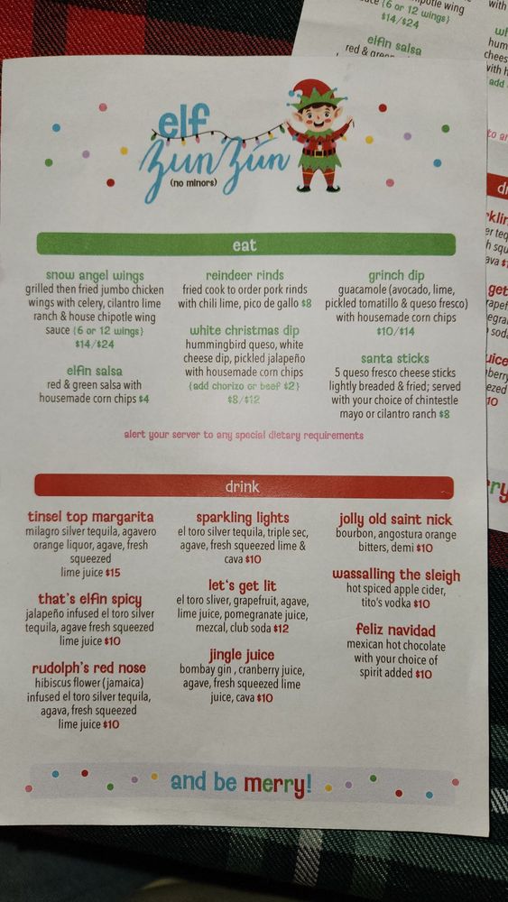 “ El Zun Zun and Leaf and Pedal are doing a fun, festive Christmas popup this holiday season. The event is open Thursday, Friday, and Saturday nights. I read about it in the Vestavia Voice. This is a small Christmas popup bar under an enclosed tent that offers music, lights, and decorations. It was super fun and will definitely get you in the holiday spirit. I ordered the Mexican hot chocolate, which was absolutely delicious. I also tried their warm apple cidar cocktail that came in a fun Christmas ornament cup. For food, they had apoetizers. We tried the white Christmas dip, which was queso and chips, and the Grinch dip, which was guacamole. There are two sizes, small and large. The small was plenty for my husband and me. ”
