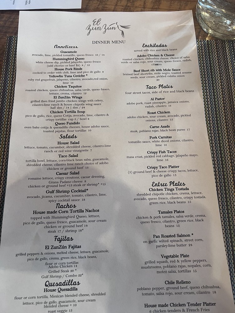 “ Great decor. Fun and festive! The chips and salsa were yummy! We had the hummingbird Queso. Loved the large chips. The Queso was a bit cold and thick. We had the chicken fajita. Large amount of grilled chicken. It could have been hotter. The service was excellent. Daniel, our waiter was very attentive checking in and bringing refills. ”